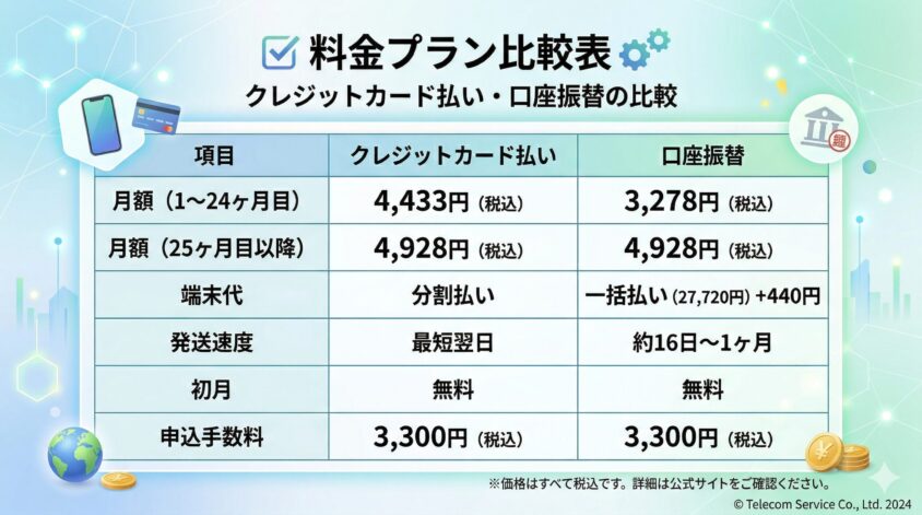 申し込みの時に一番迷ったのは支払い方法の違いだった。クレジットカードと口座振替で、同じサービスなのに条件がかなり変わるんだ。