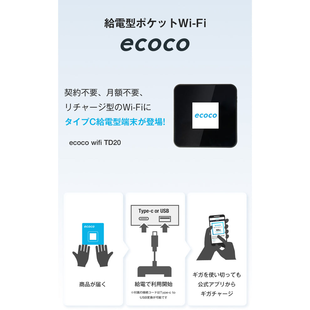 ecocoは、USBポートに挿すだけで簡単にネット接続ができるコンパクトで持ち運びやすいスティック型Wi-Fiで、外出先でも手軽に利用可能です。