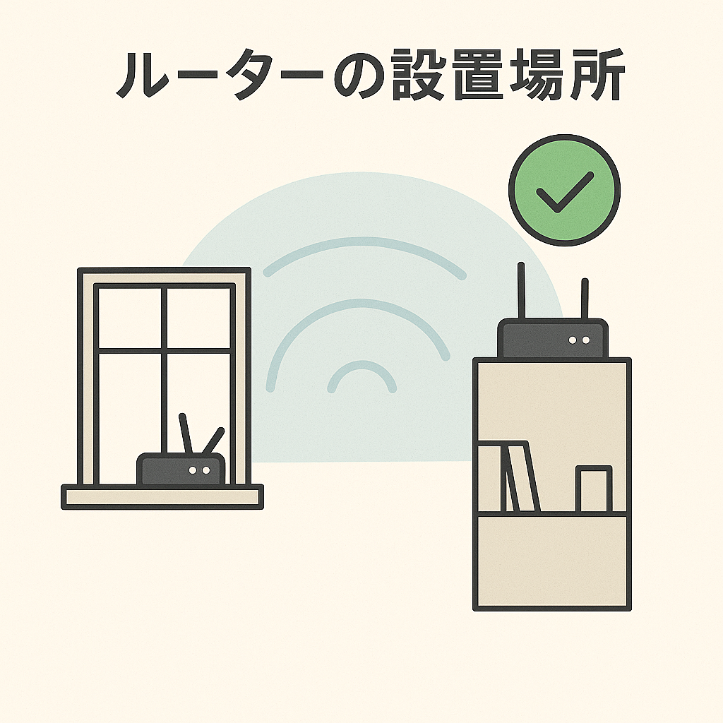 3. 設置場所の見直し | ルーターを窓際や部屋の中央 1メートル以上の高い場所に 移動。 | 障害物や電波干渉を避けることで通信状況が改善される可能性が あり。 |