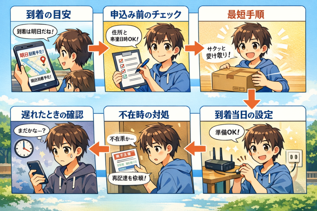 「到着の目安 → 申込み前のチェック → 最短手順 → 遅れたときの確認 → 不在時の対処 → 到着当日の設定」という流れで整理しました。
