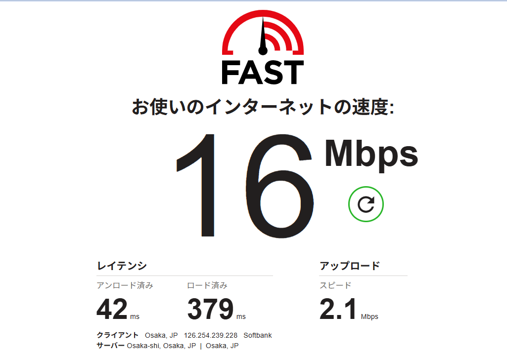 実際に筆者が福岡市内で測定した結果、実測値は下り11〜29Mbps / 上り1.7〜3,7Mbpsでした。