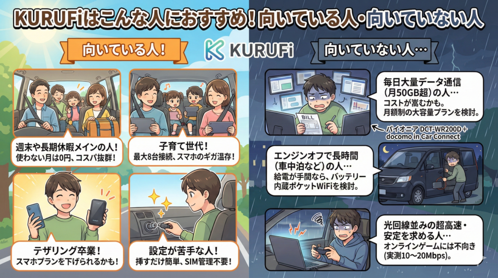 車内の通信をKURUFiに分離するとスマホのデータプランを下げられる可能性もあります。 - 複雑な設定が苦手でシンプルに使いたい人