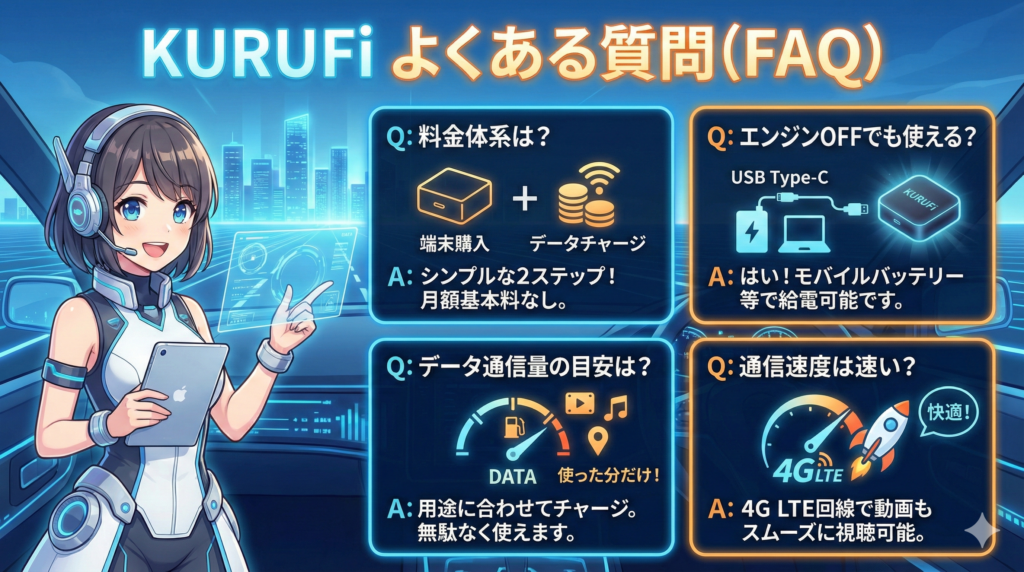 KURUFi(クルファイ)は、月額料金0円・契約不要で使える車載専用WiFiサービスです。