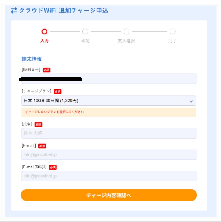 クラウドWiFi 追加チャージ申込