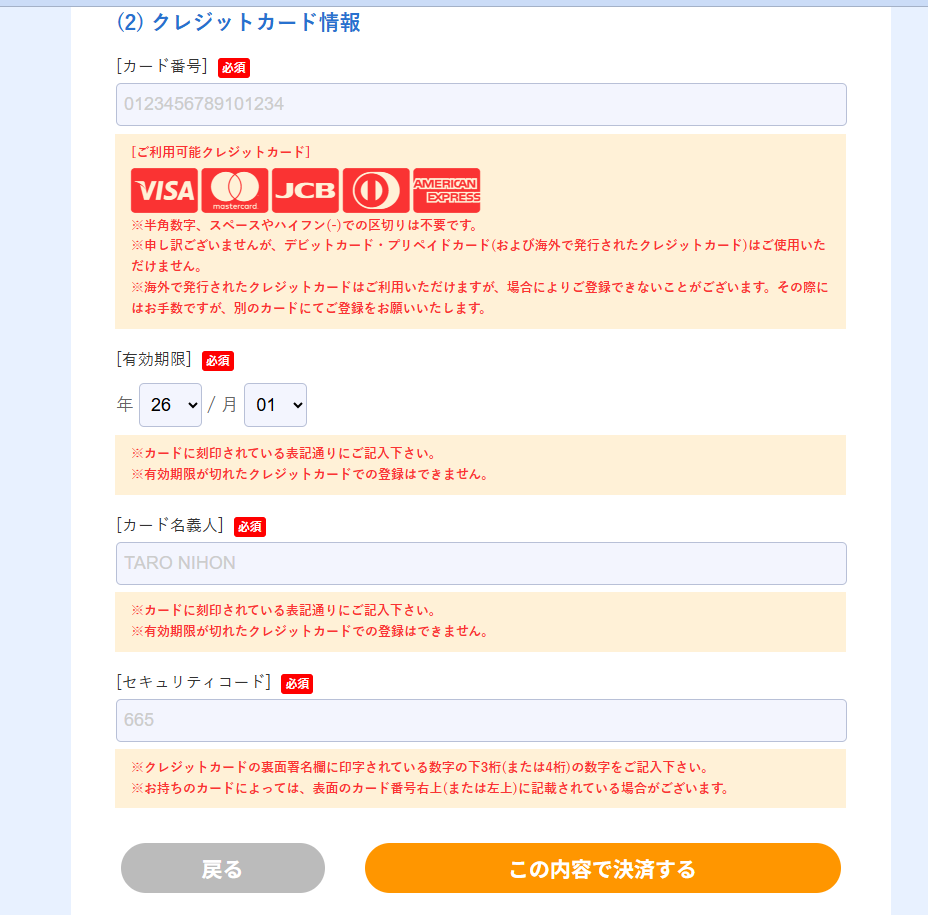 - クレジットカード決済ですが、都度の支払いとなるため、カードの登録は不要です。