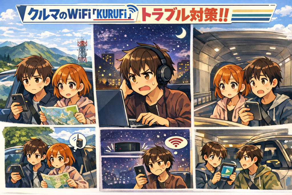 端末を一度抜き差しして再起動すると、スマホと同様に解決する場合がありますが、改善しない場合は車種を伝えてクルマのWiFi「KURUFi」公式サポートに相談するのがおすすめです。