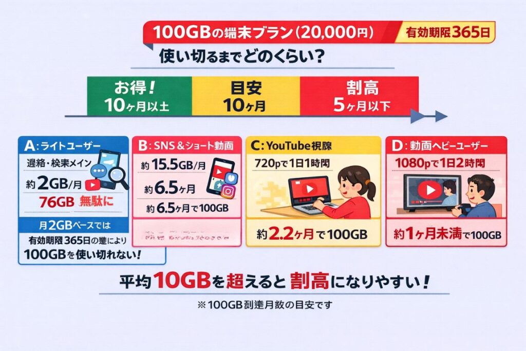 - 100GB付きで端末費用は20,000円(初回のみ)