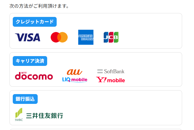 | 多様な支払い方法 | 銀行振込やコンビニ払いなどに対応します。 | クレジットカードがなくても購入できます。 |