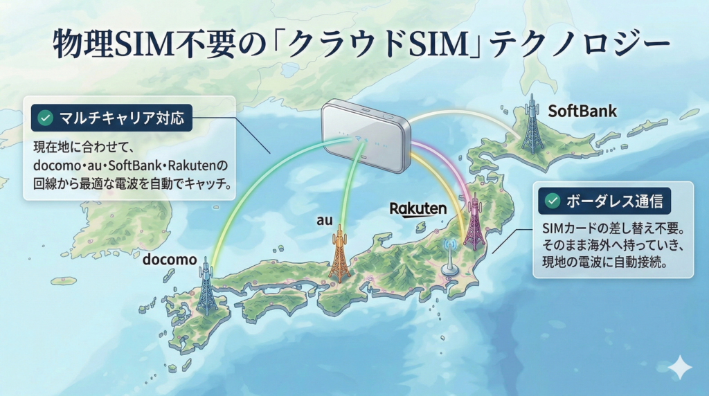 これが「SIMカード不要」「複数キャリア対応」を実現している仕組みです。