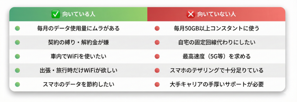 買い切りWiFiは万能ではなく自分に合っているかどうかを見極めるために、向いている人・向いていない人を整理しておきましょう。