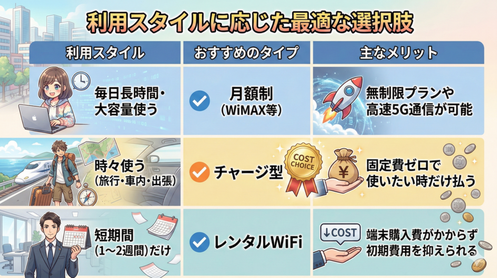 「買い切りWiFiは全員にお得」というわけではありません。自分の使い方に合っているかどうかが大事。この正直さこそ、信頼できる記事の証です!