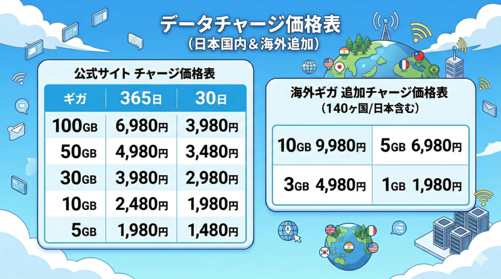 | 追加100GB/365日 | 6,980円 | 6,980円 | 7,480円 | 6,480円 | 6,980円 |