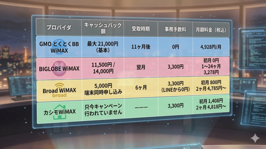 WiMAXキャッシュバック主要4社を一覧比較【2026年最新】