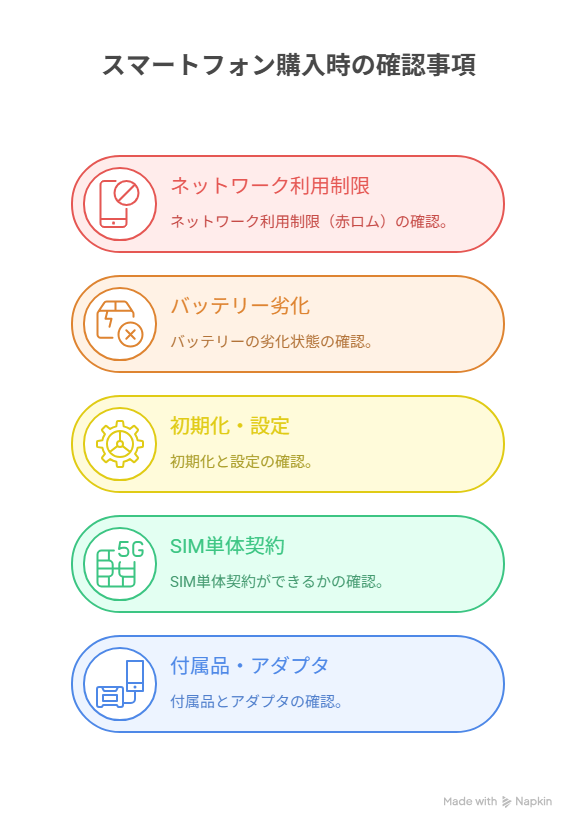とくに「ネットワーク利用制限」と「SIMロック解除済み」は、失敗しないための最重要チェックポイントです。