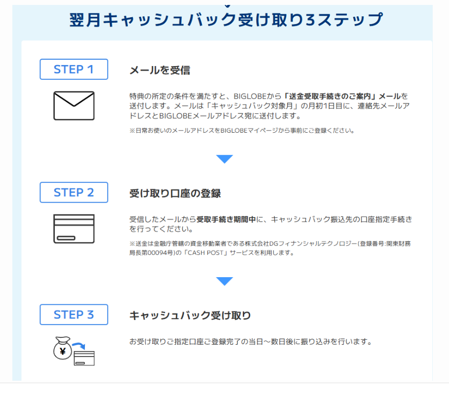 - キャッシュバック対象月の2日目午後から45日以内に、BIGLOBEのマイページでキャッシュバック受け取り手続きを完了します。(振り込み先口座番号)